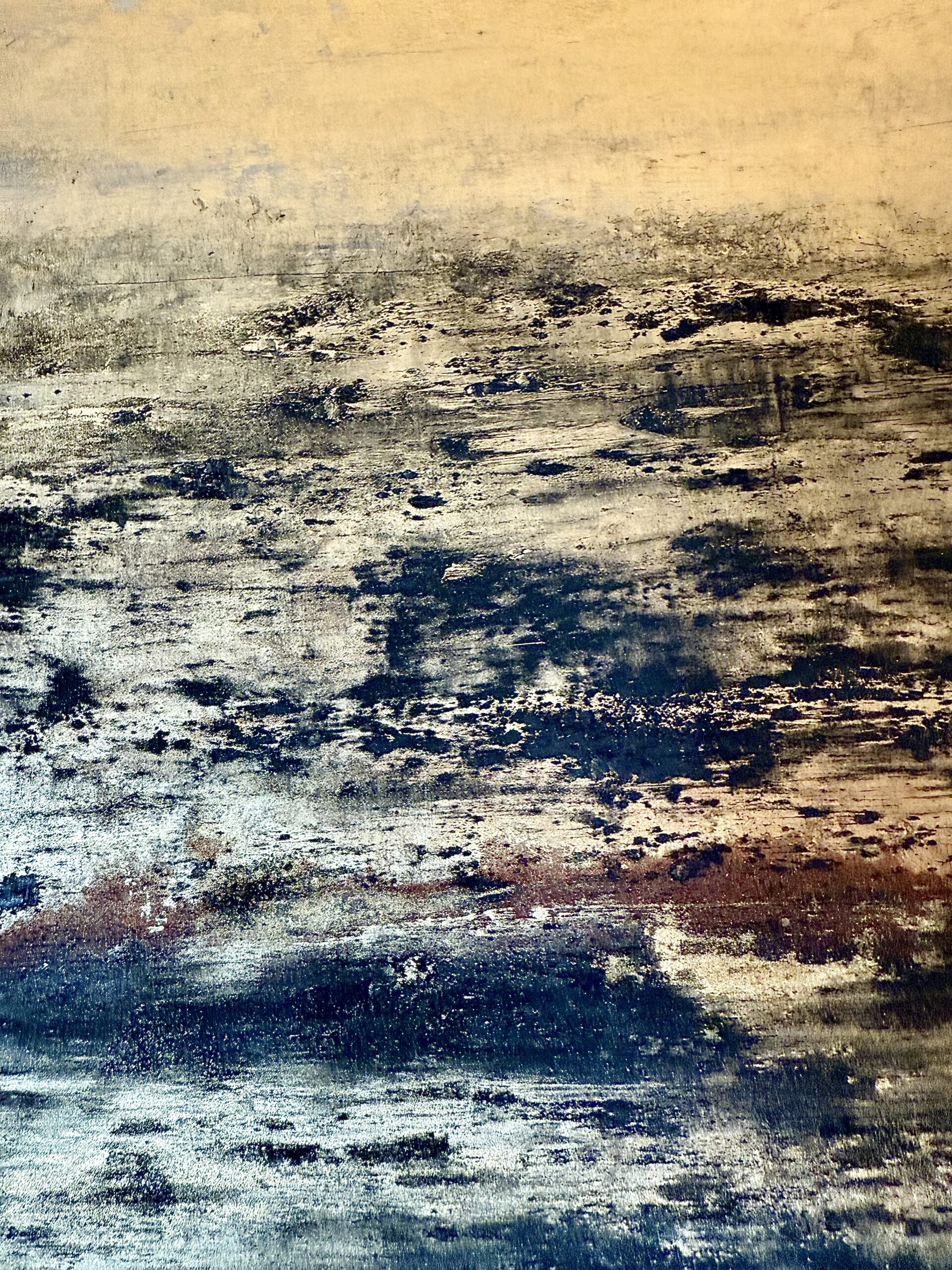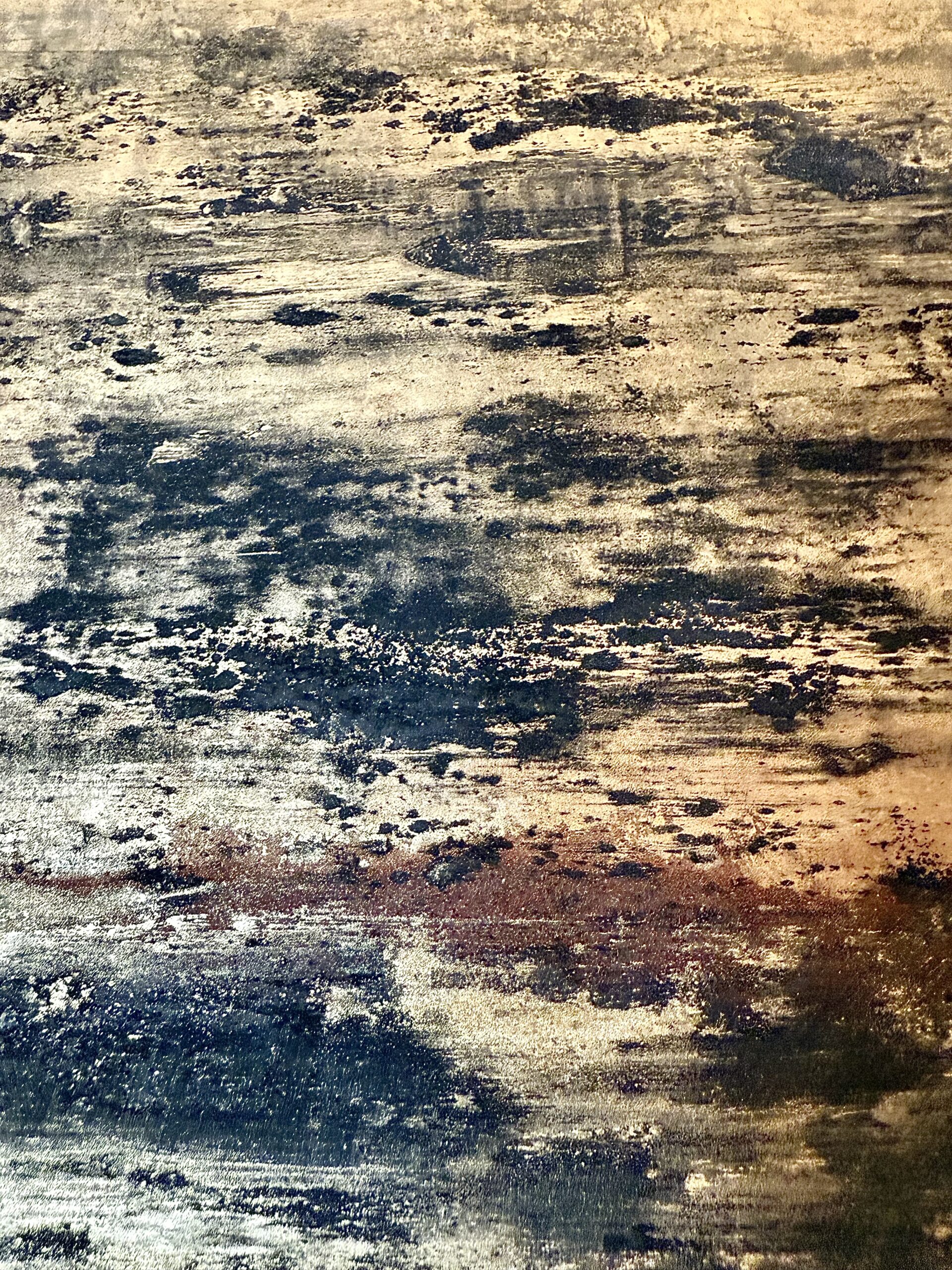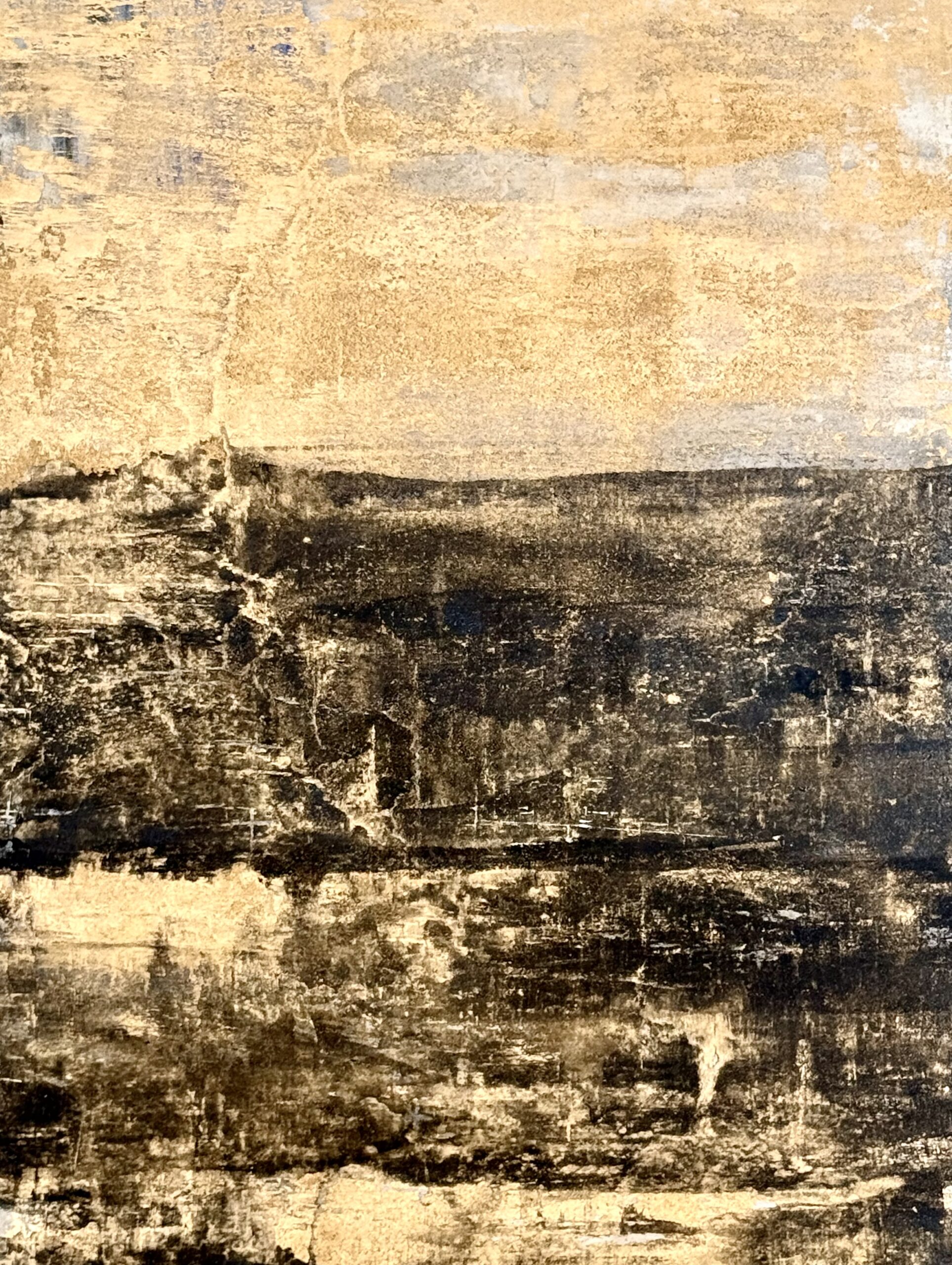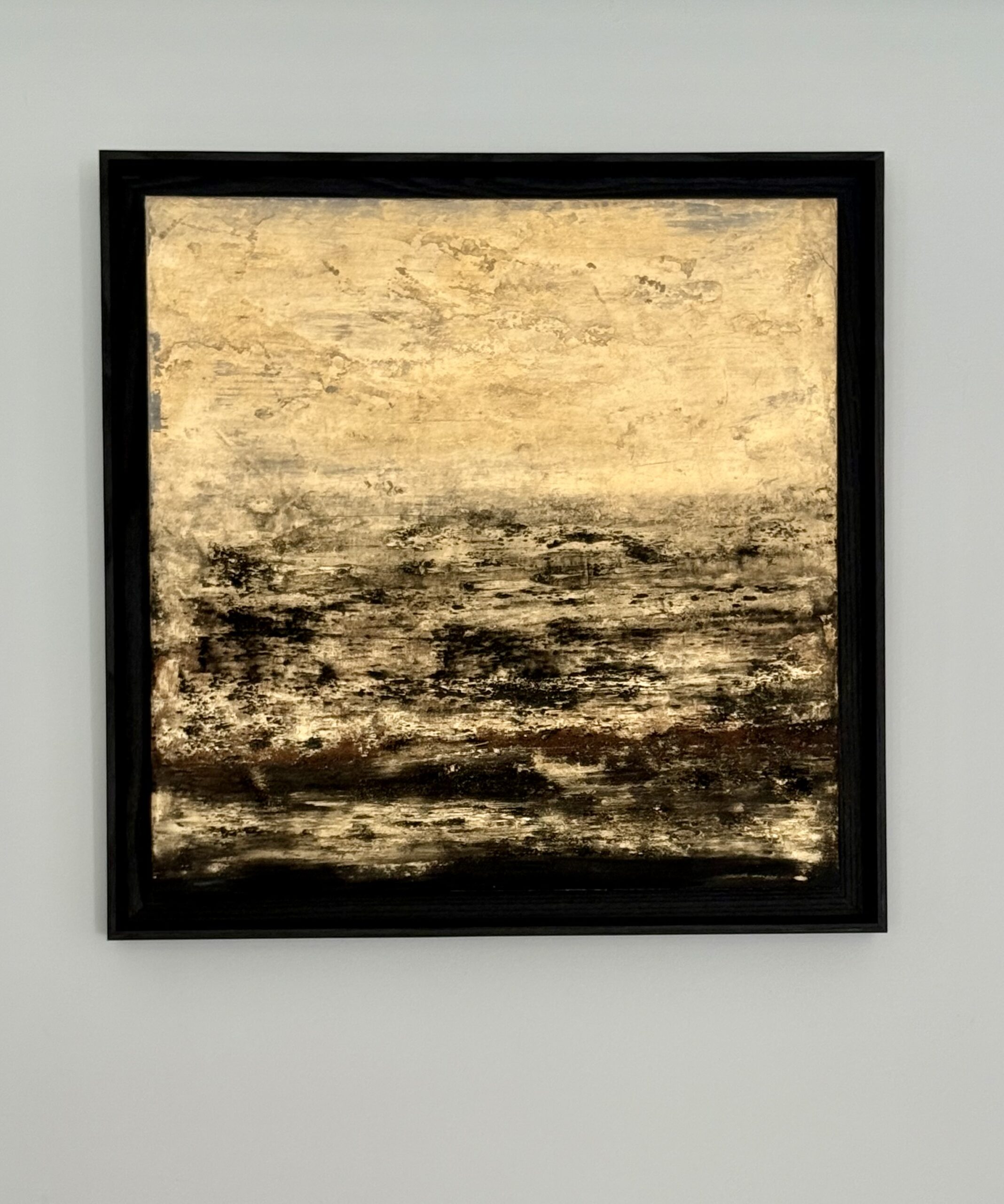 Les pigments minéraux, les charbons de bois, les terres naturelles, denses et opaques, rencontrent la lumière chaude et nuancée de l’Or, formant un contraste subtil entre ces matériaux.